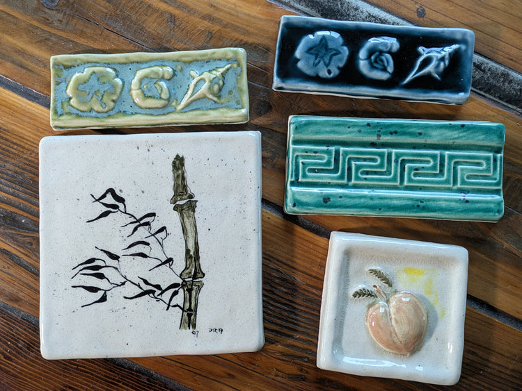 Handcrafted stoneware tile. Liners, deco, field and painted tiles. These are hand pressed hand painted. There is a slight variation in tile colors shapes and sizes.
