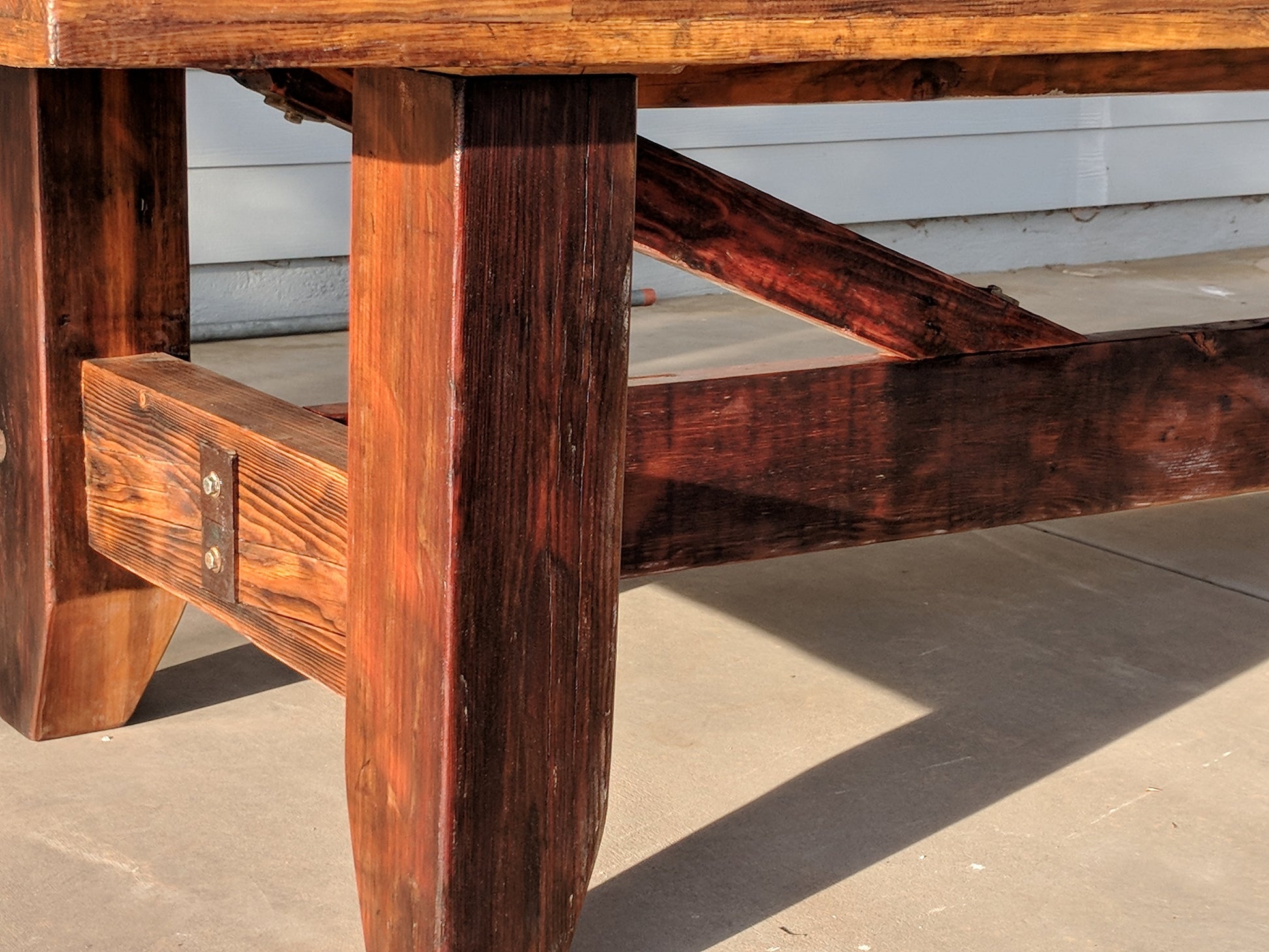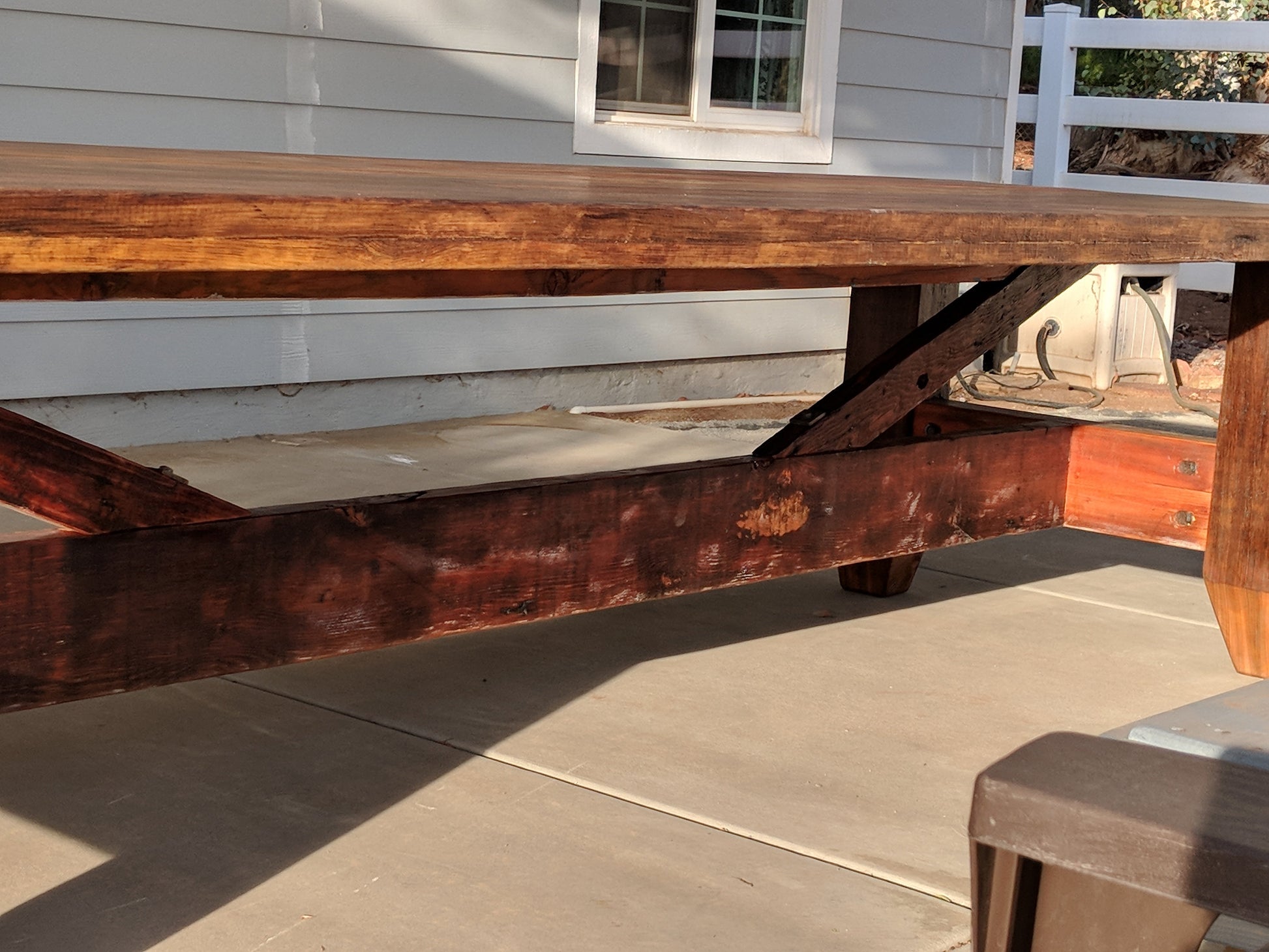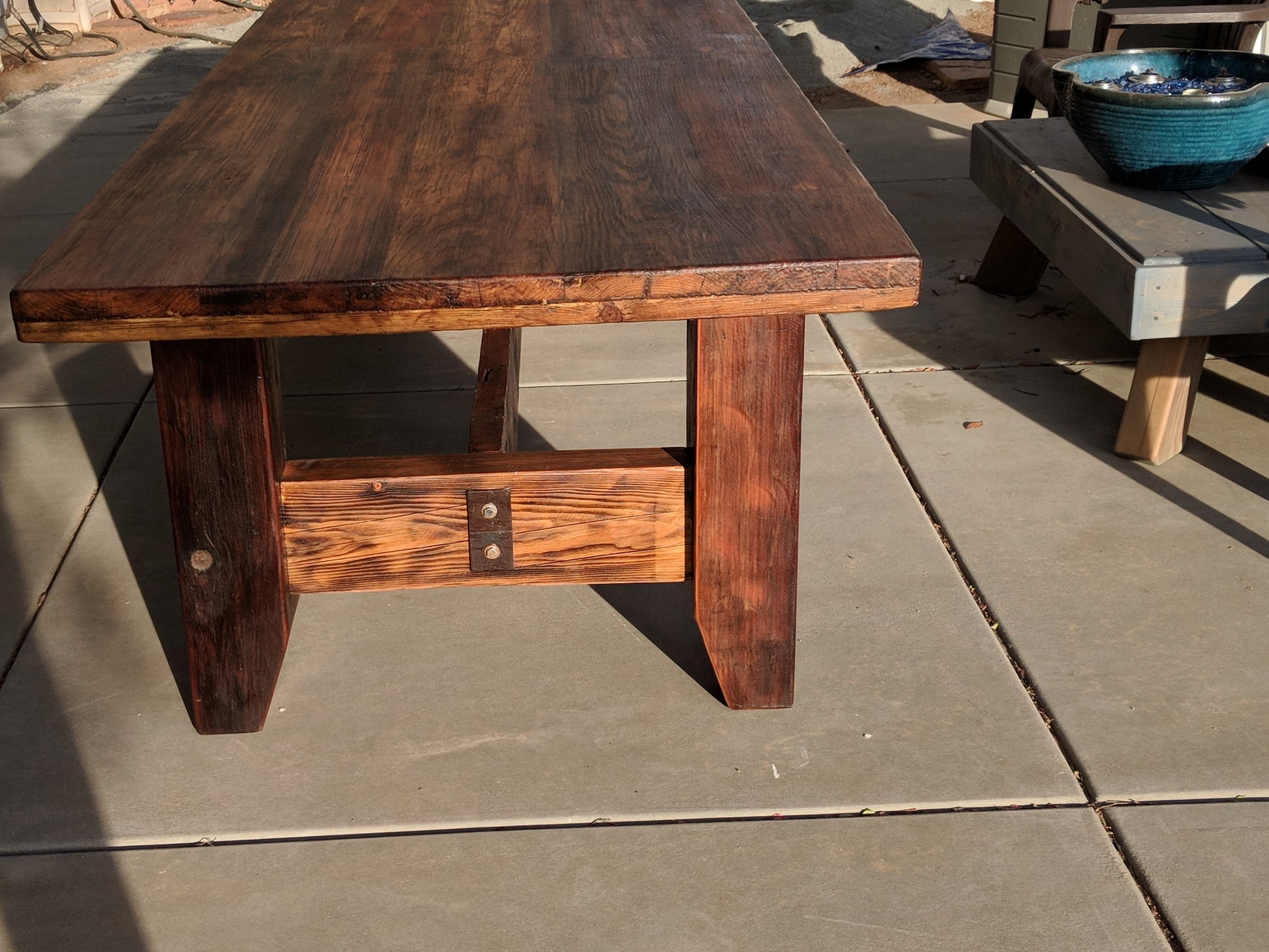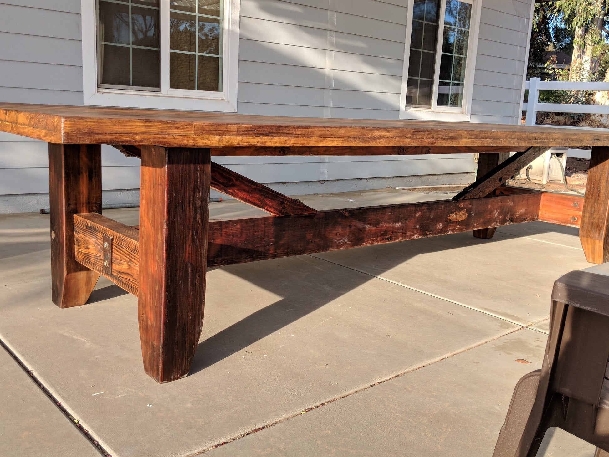 12' outdoor table. 6" x 6" aged cedar legs, 7" x 2" support beam. Top is from reclaimed scaffolding planks.aged to perfection.