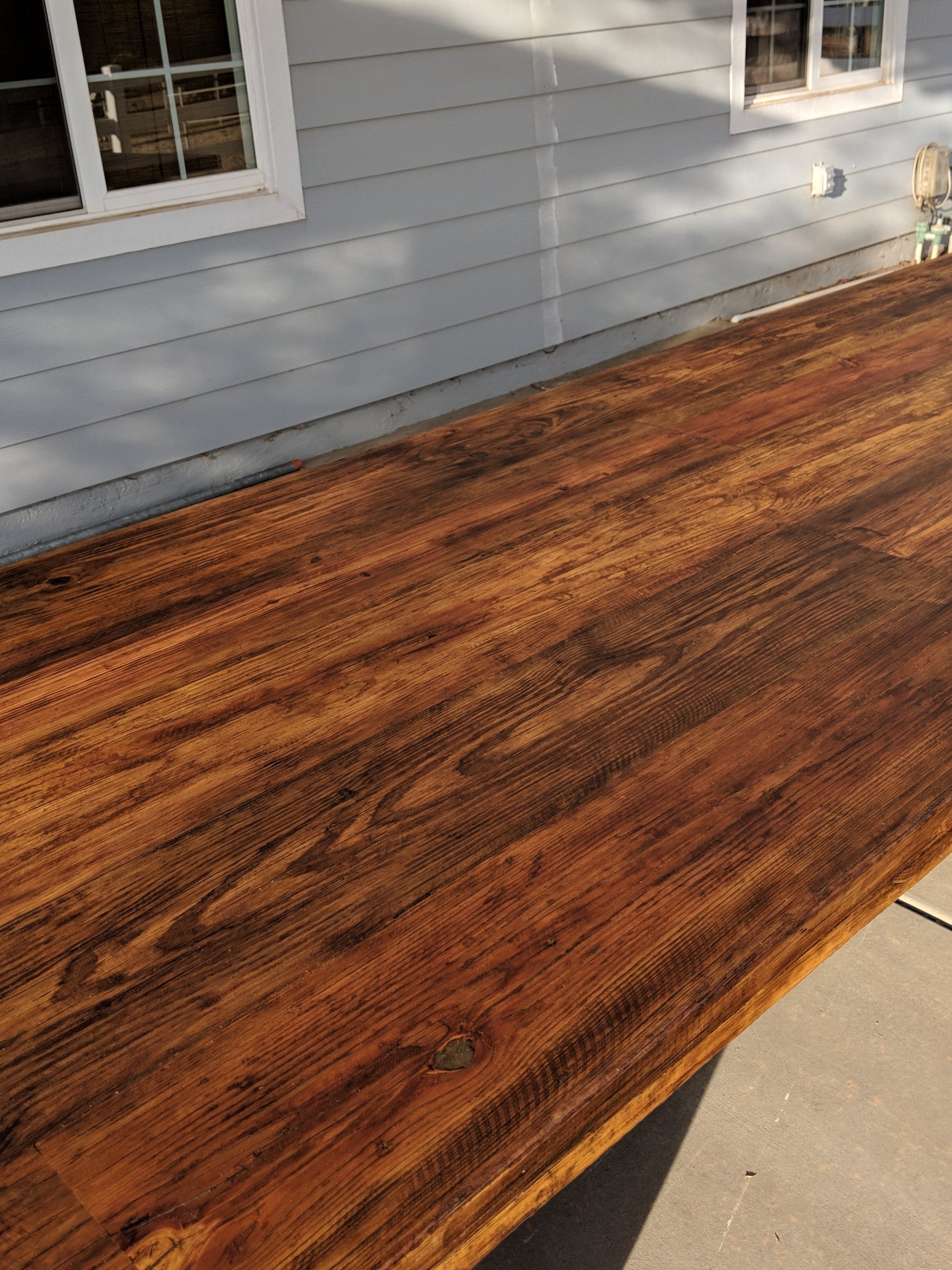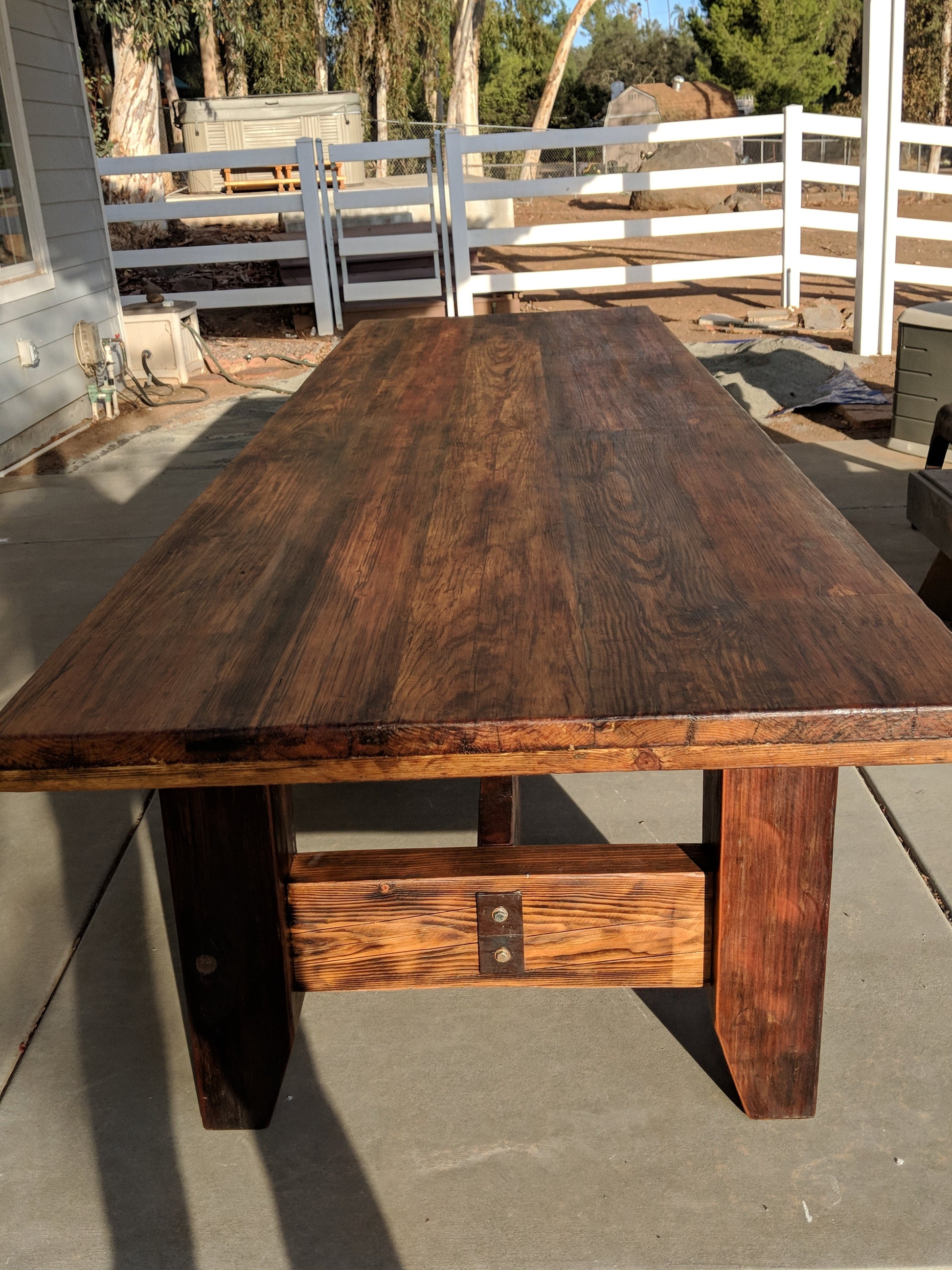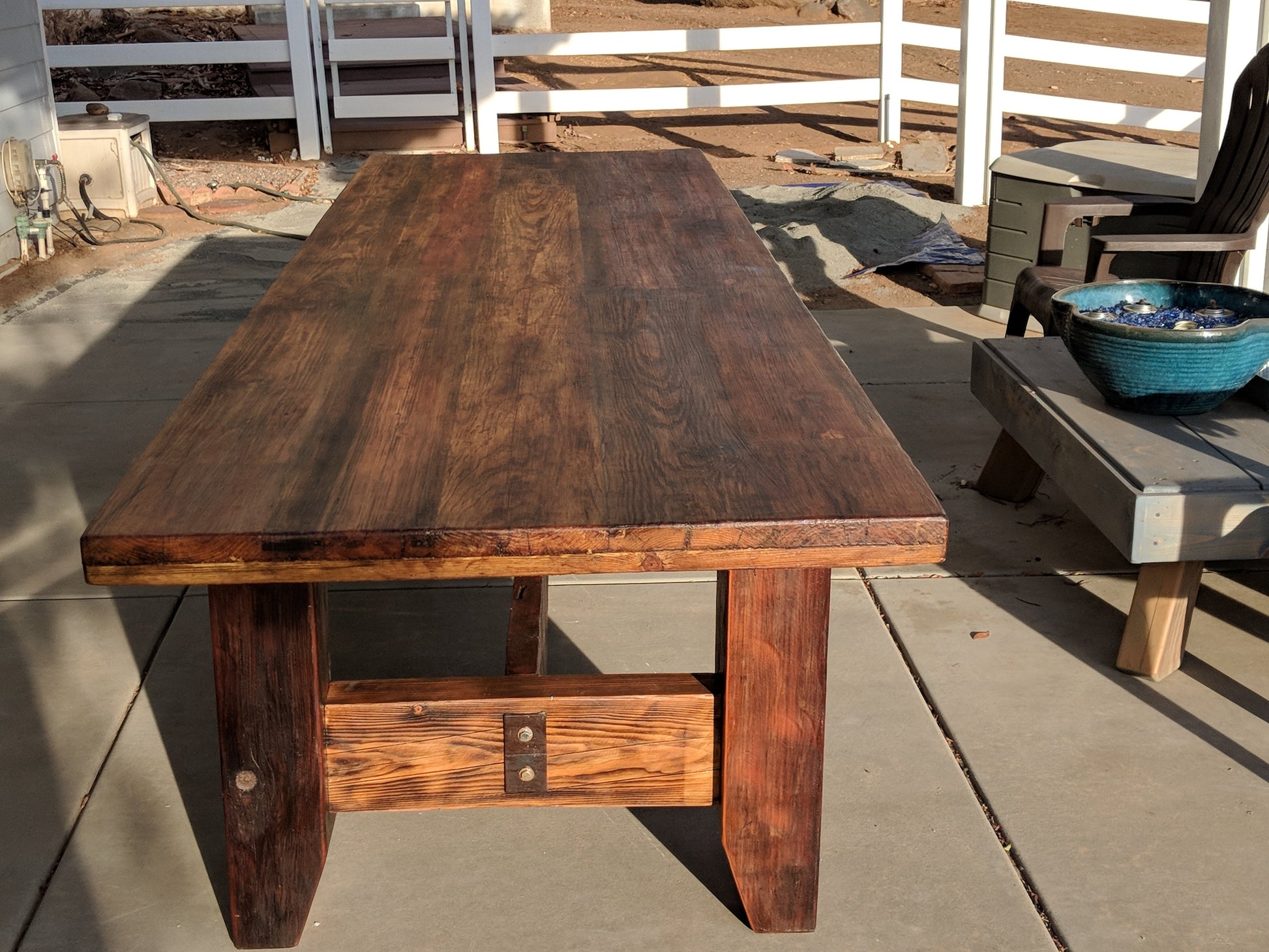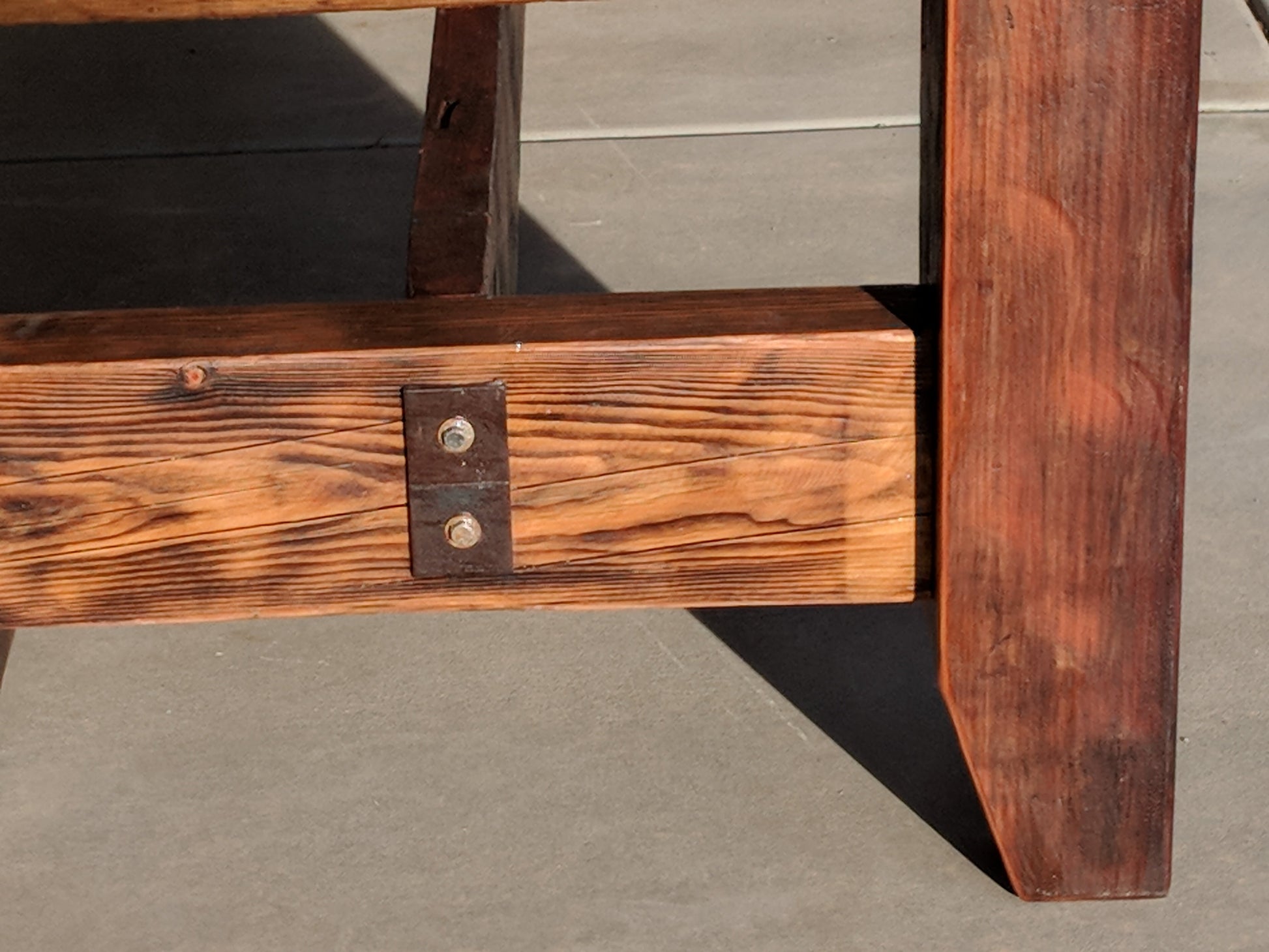 12' outdoor table. 6" x 6" aged cedar legs, 7" x 2" support beam. Top is from reclaimed scaffolding planks.aged to perfection.