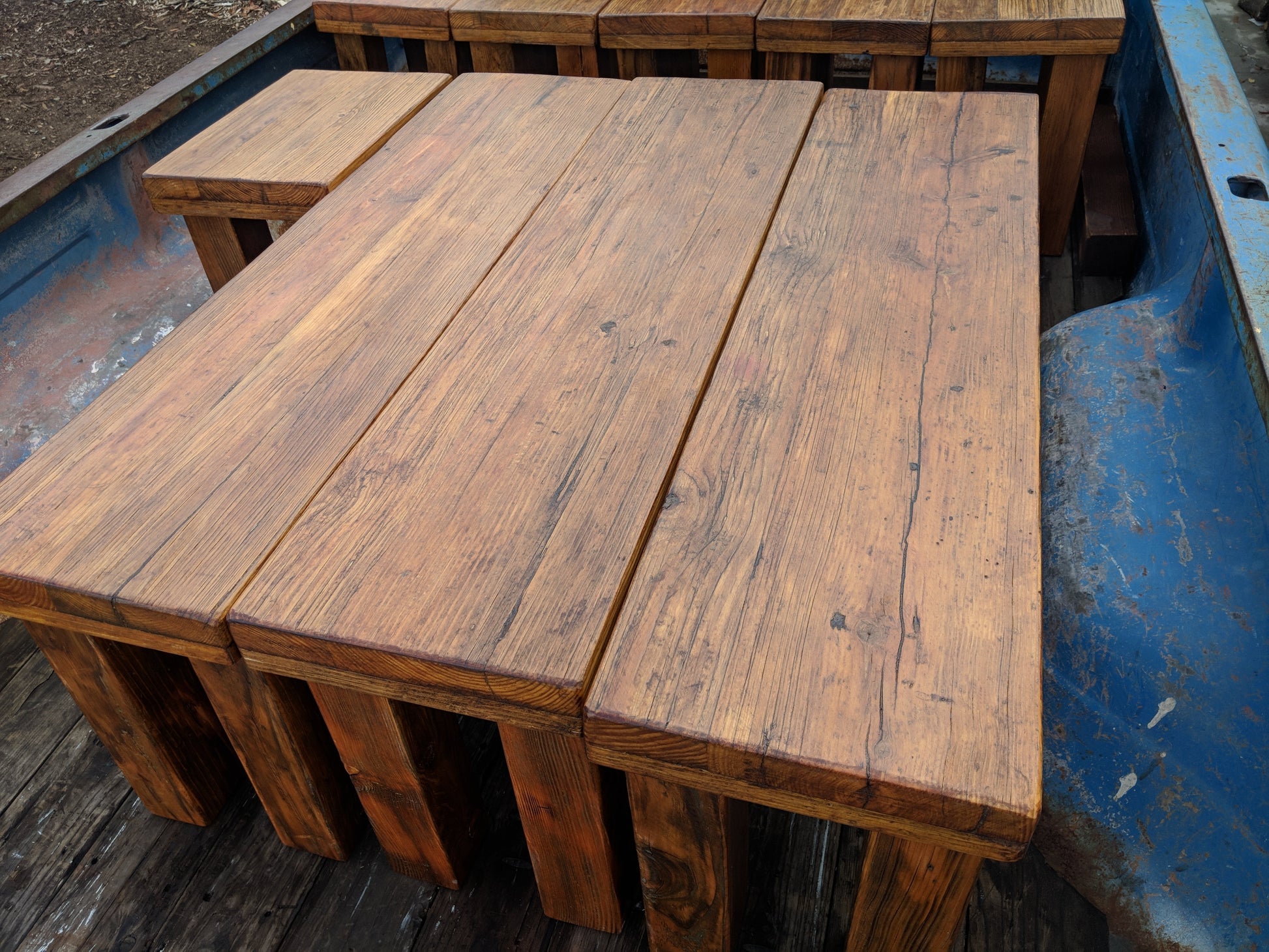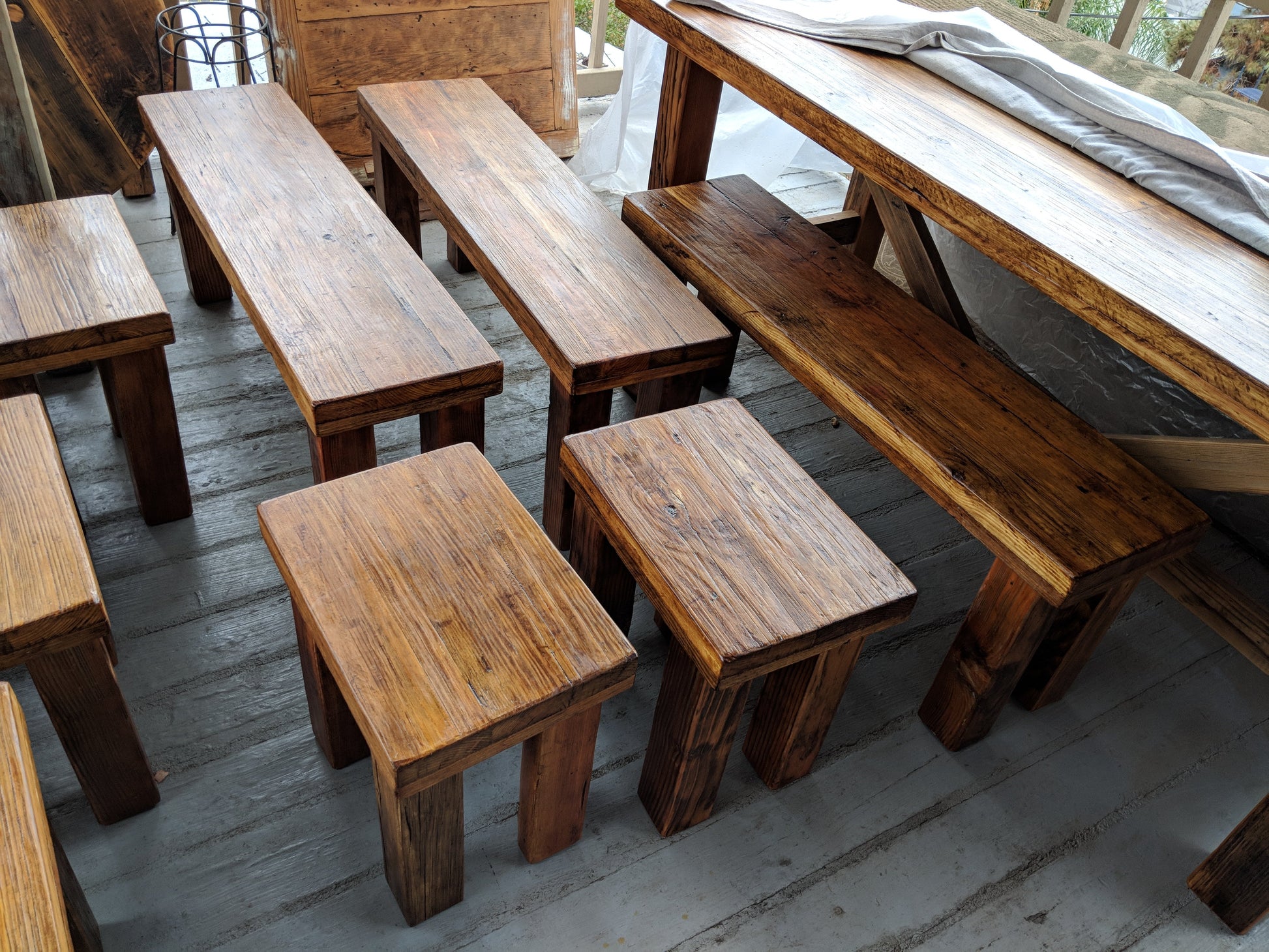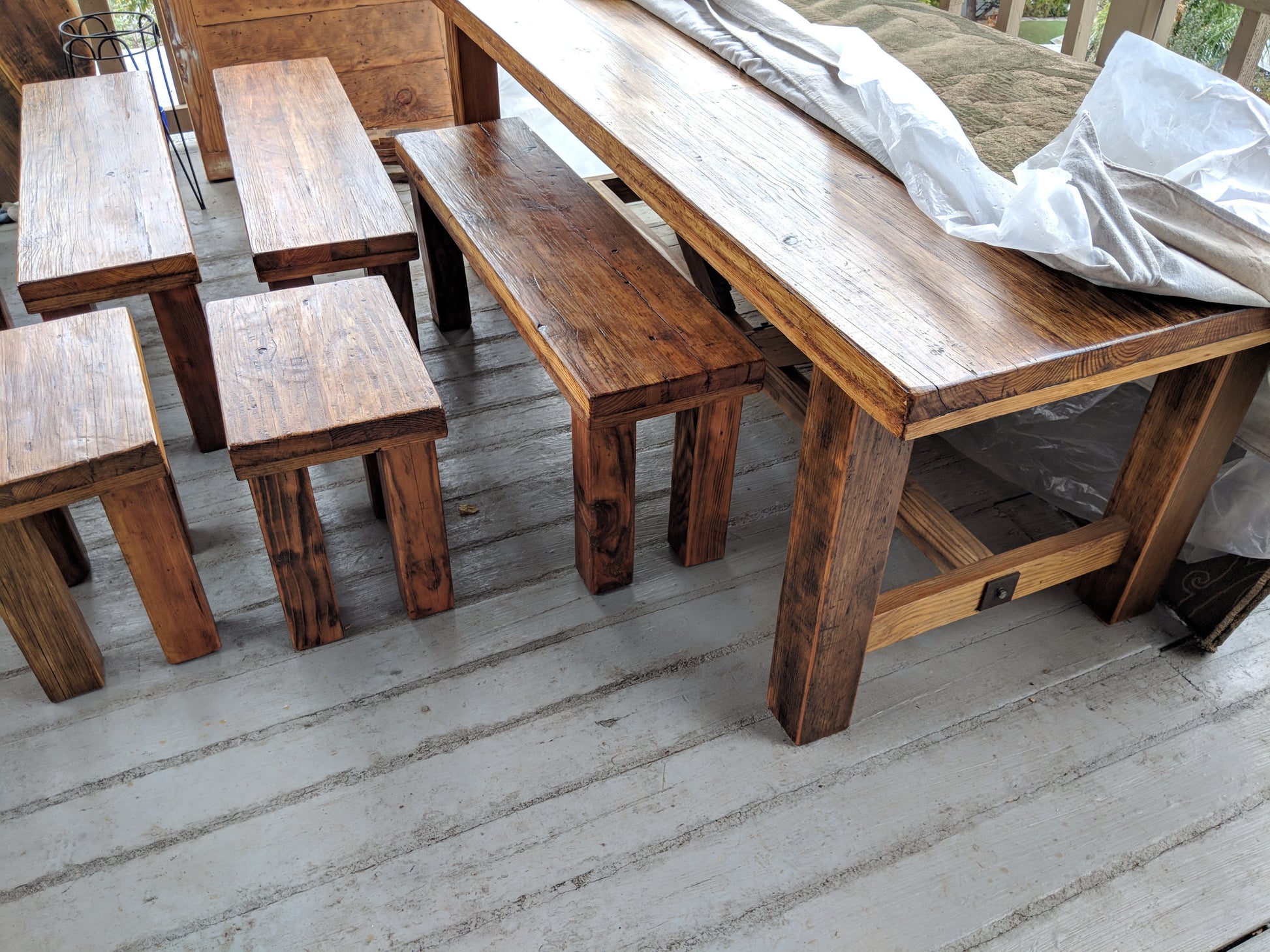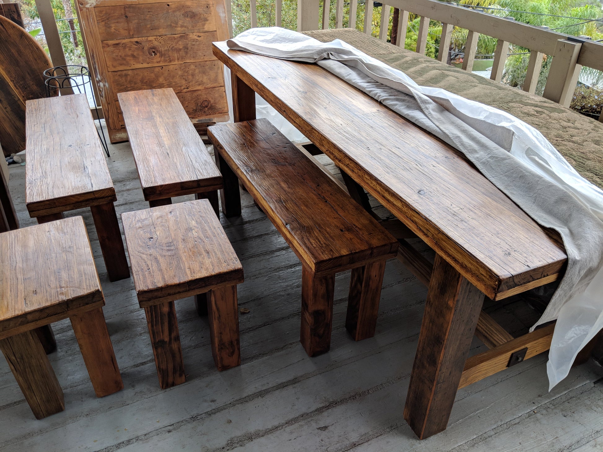 12' x 44" x 30" tall trestle base reclaimed wood outdoor table. Marine grade epoxy with poly sealer. 3 benches, 6 stools. *** Local pickup only ***