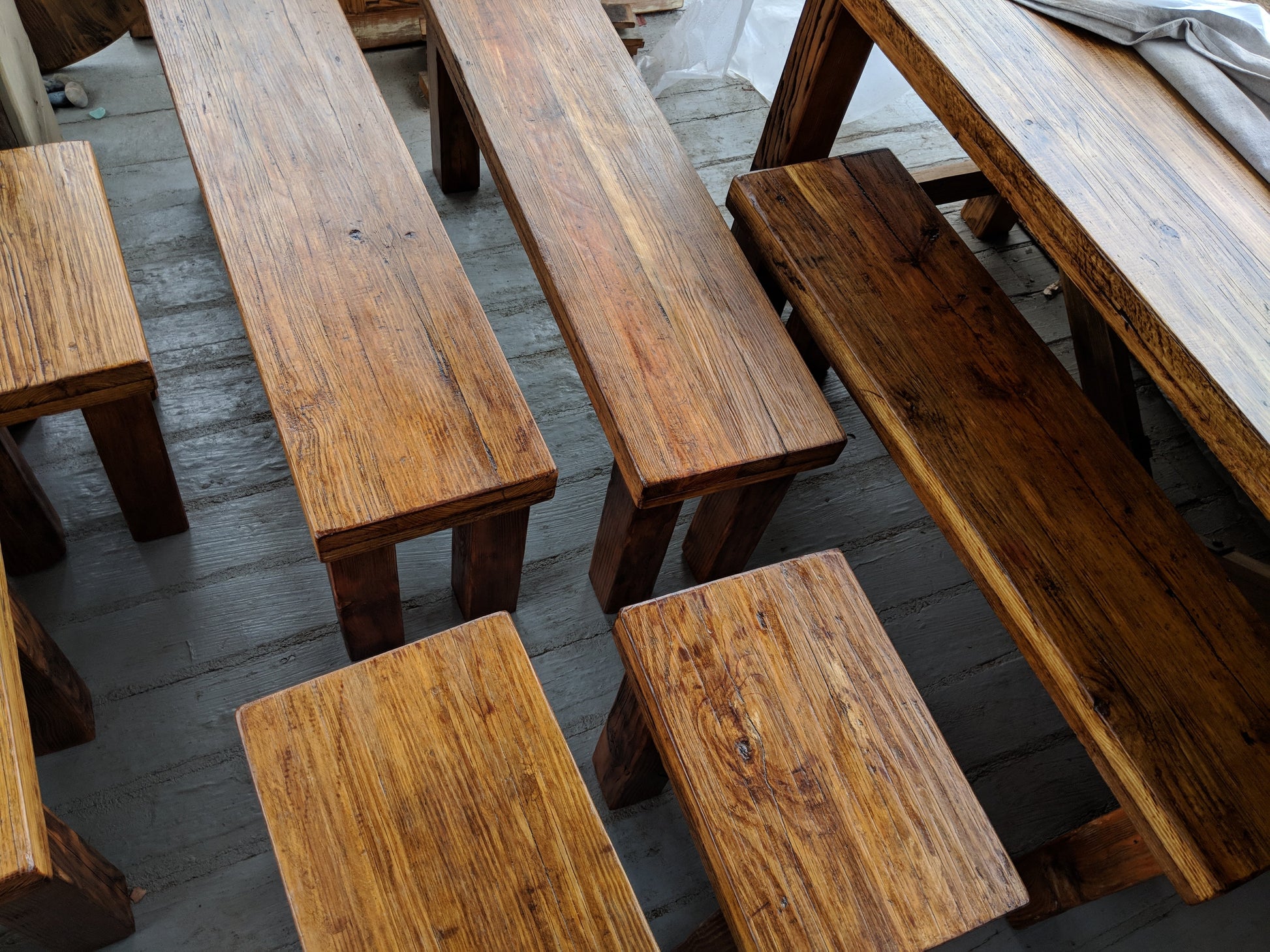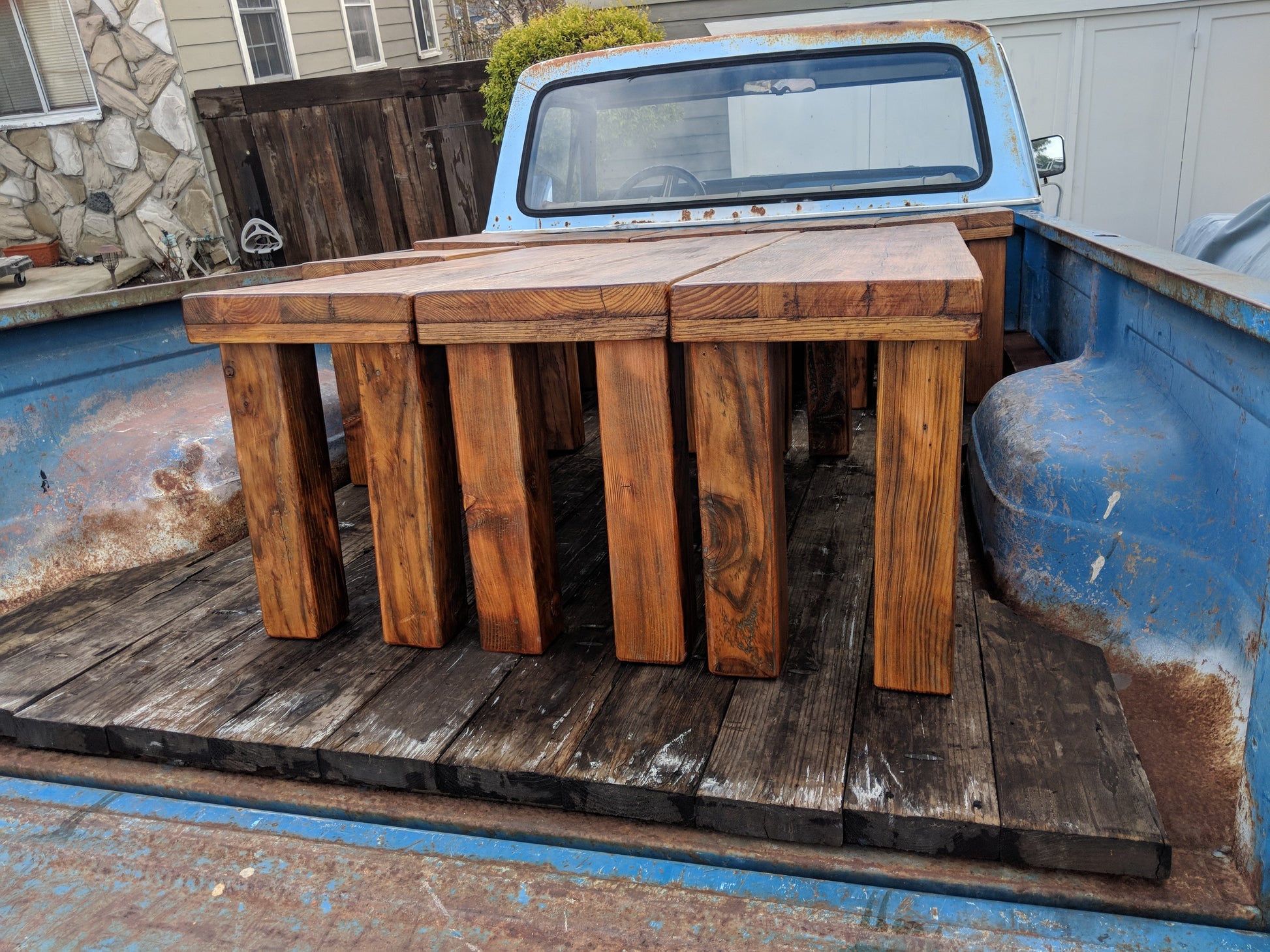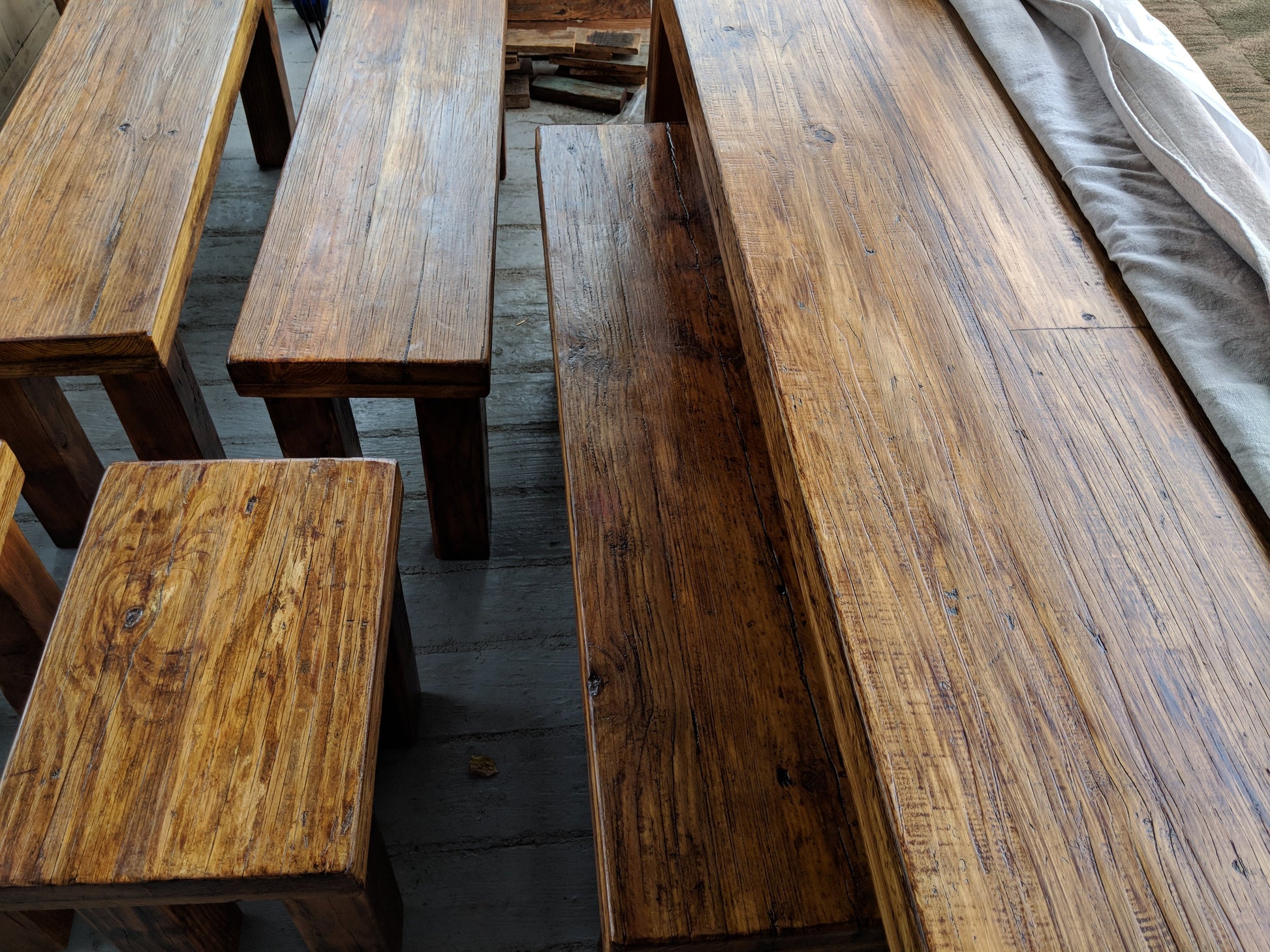 12' x 44" x 30" tall trestle base reclaimed wood outdoor table. Marine grade epoxy with poly sealer. 3 benches, 6 stools. *** Local pickup only ***