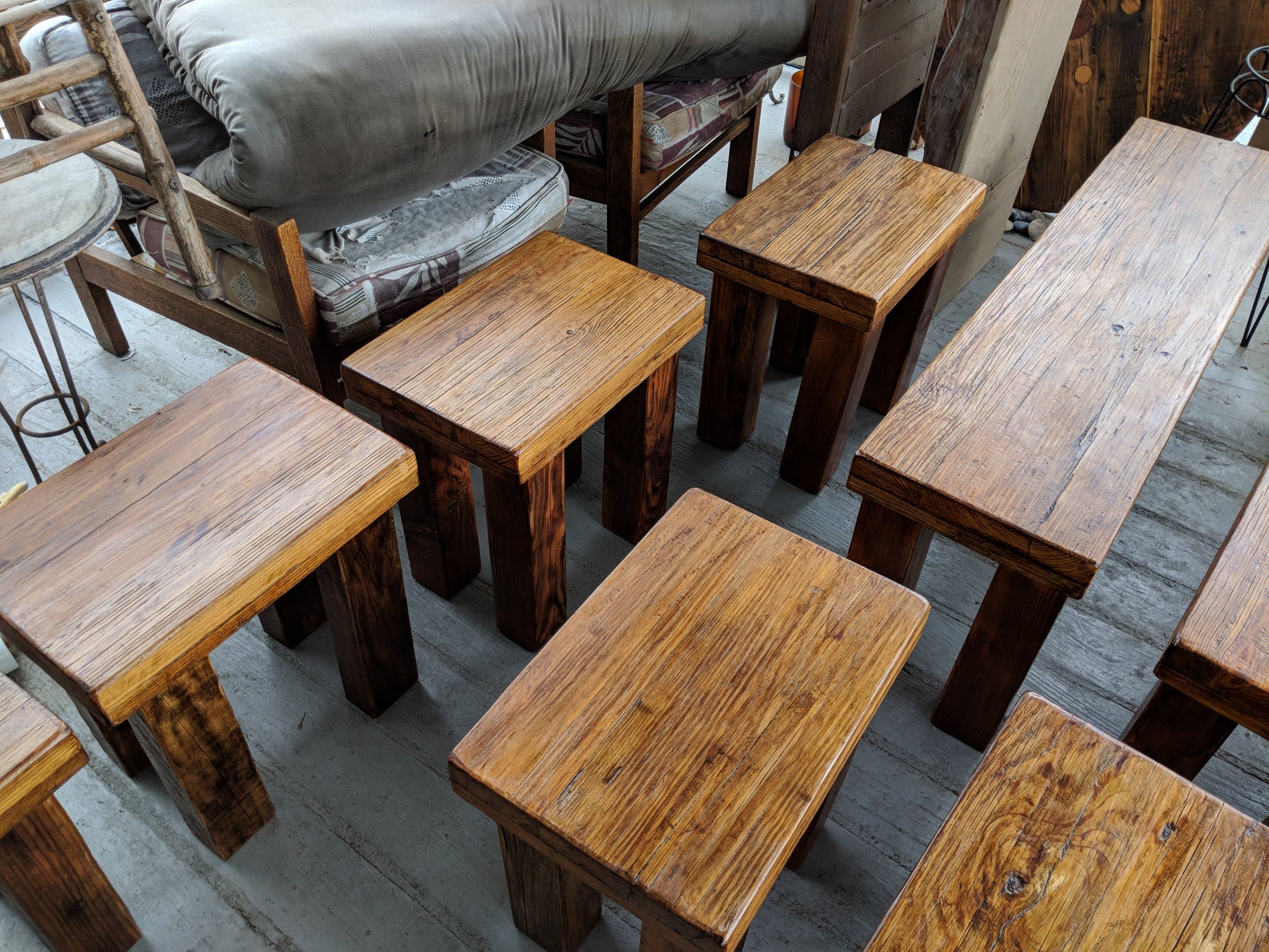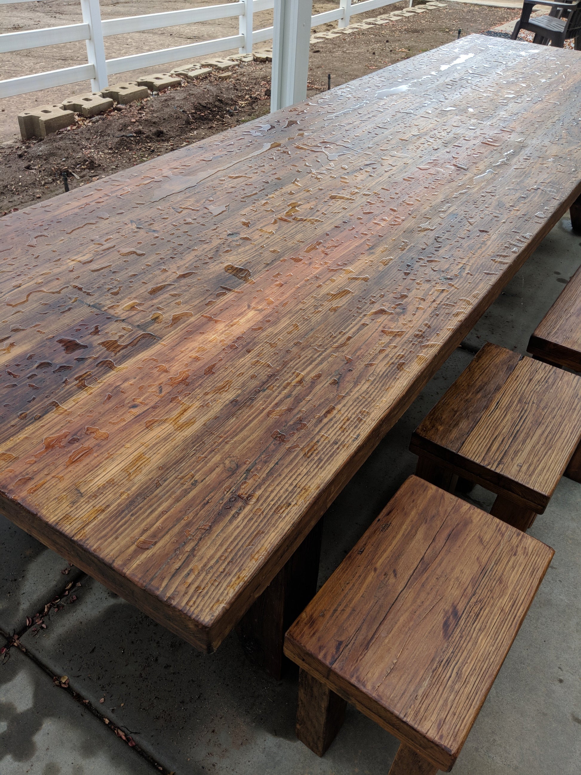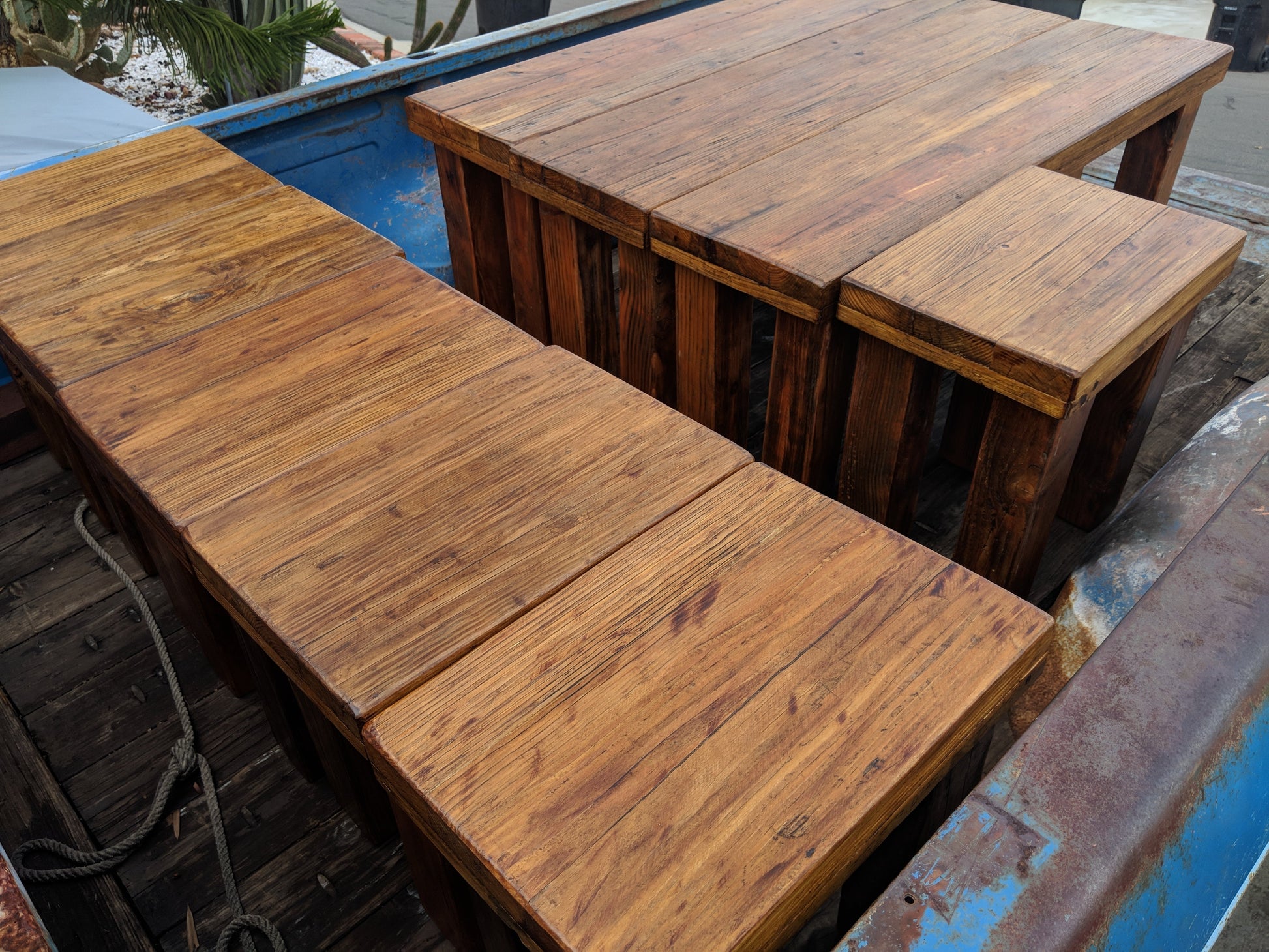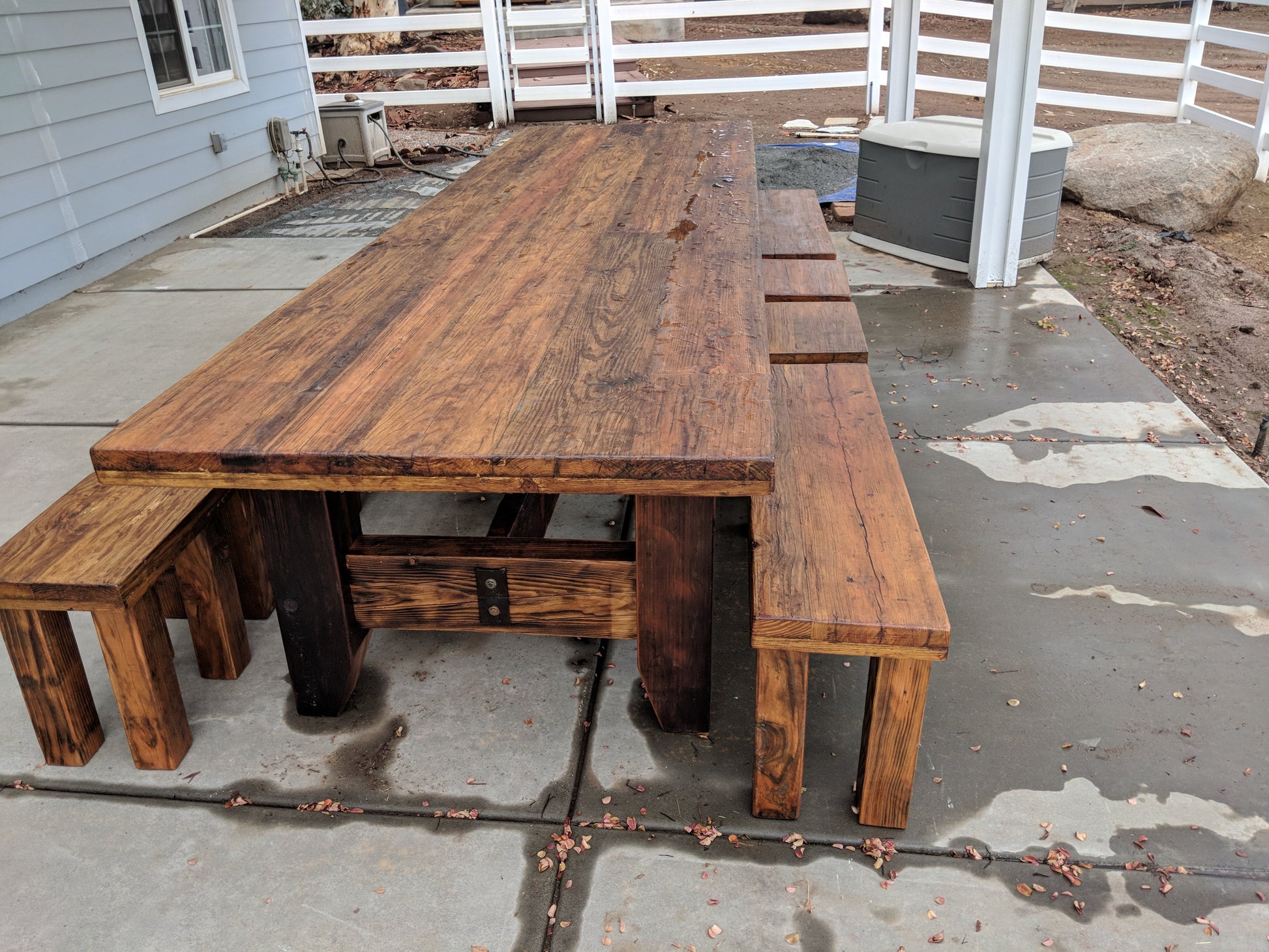 12' x 44" x 30" tall trestle base reclaimed wood outdoor table. Marine grade epoxy with poly sealer. 3 benches, 6 stools. *** Local pickup only ***