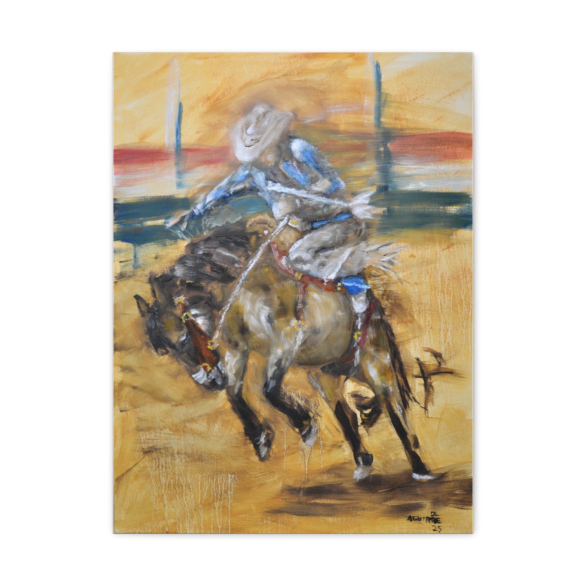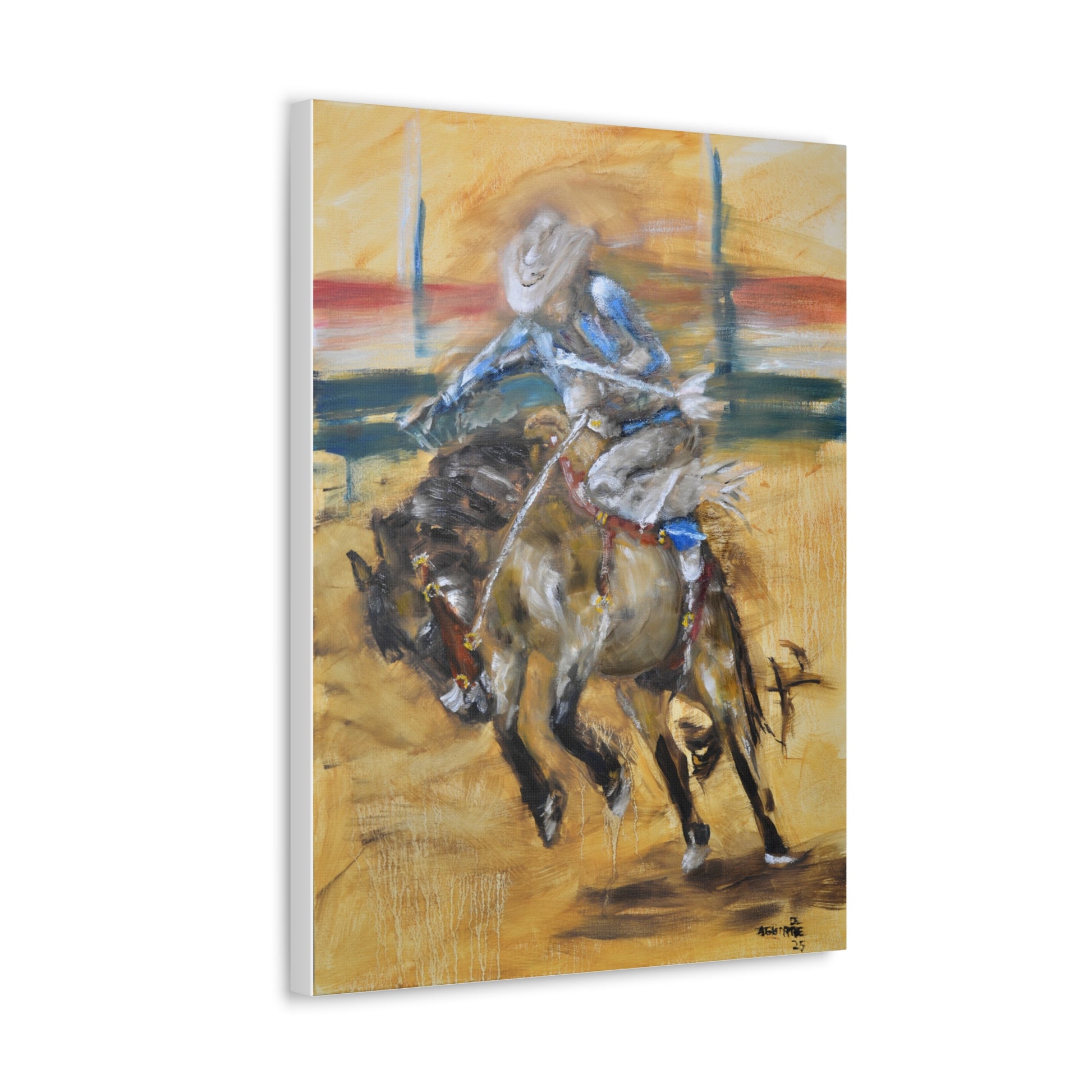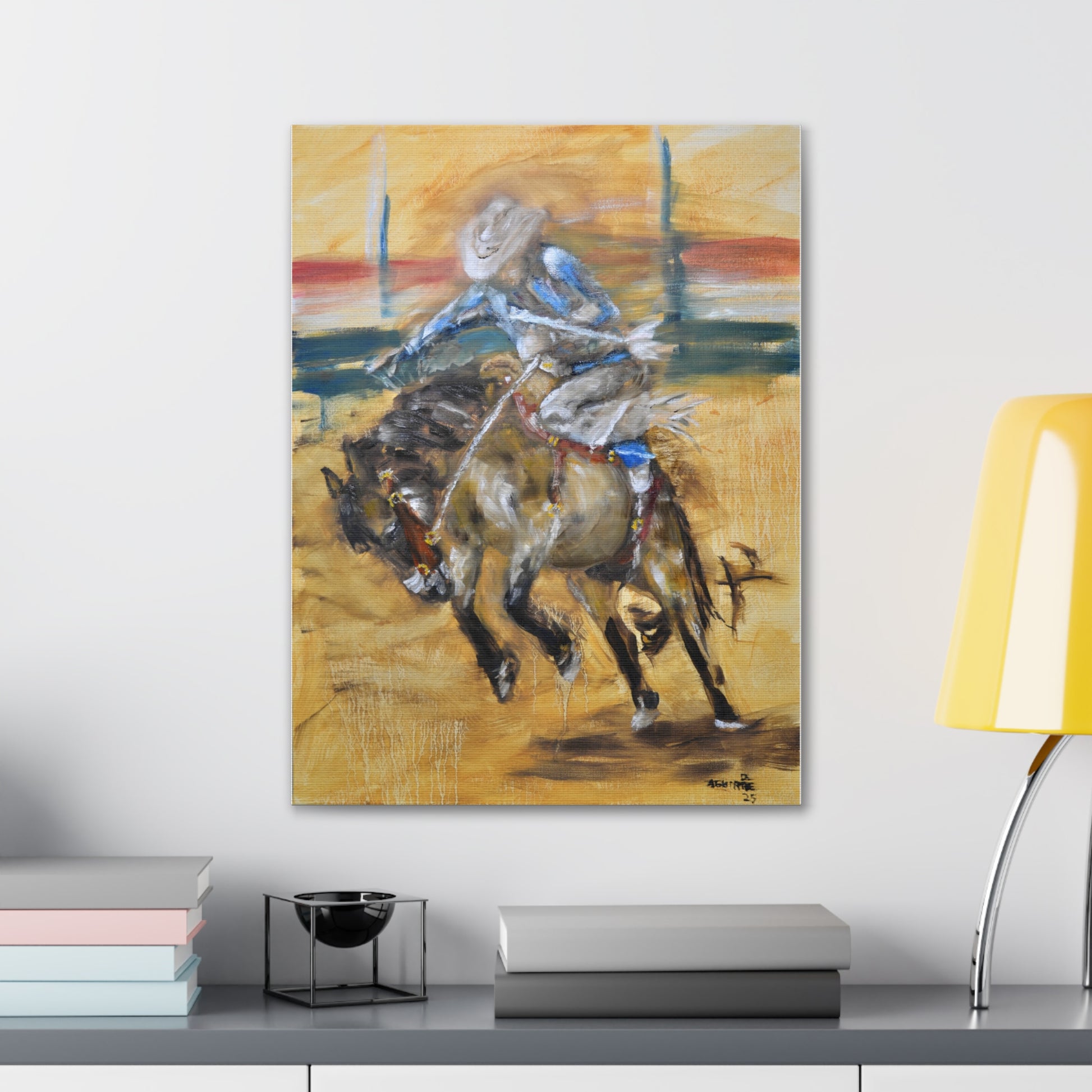 Rodeo bronc rider at the lakeside rodeo in San Diego. Perfect for western and cowboy enthusiasts, this high-quality canvas will bring a rustic vibe to any space. Ideal for home decor, western-themed parties, and cowboy celebrations.
